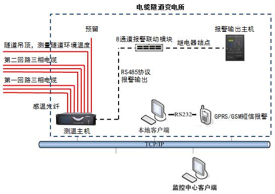 我公司的FET-8608L型光纖測溫主機最大單機測試容量為8通道/10公里。根據項目要求,我們選擇8通道測溫主機。1、2、3通道每通道分別監控第一回路的A、B、C三相電纜溫度,4、5、6通道每通道分別監控第二回路的A、B、C三相電纜溫度,7通道監測隧道環境溫度、8通道做冗余擴展。測溫主機的輸出信號送到上位機進行集中顯示和報警輸出,并可以通過RS-485接口將數據傳送到其他監控系統。系統可以在電站其他地方設置遠程監控客戶端,使用電站內部的網絡就可以在遠端通過計算機監控系統向監測系統發指令,問訊并直接獲得實時參數、表格、趨勢曲線和圖片,實時獲取測溫主機測得的電纜實時溫度曲線測溫主機運行狀況,實現遠程監控及數據分析。