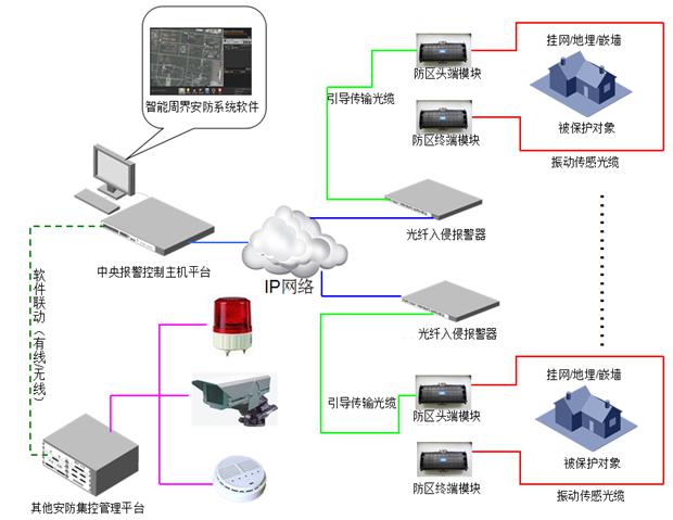 多臺報警器集中管控時,系統主要監控報警平臺(包括上位機、管理軟件)、光纖入侵報警主機、防區頭&終端光學模塊、引導傳輸光纜、前端振動傳感光纜等組成。