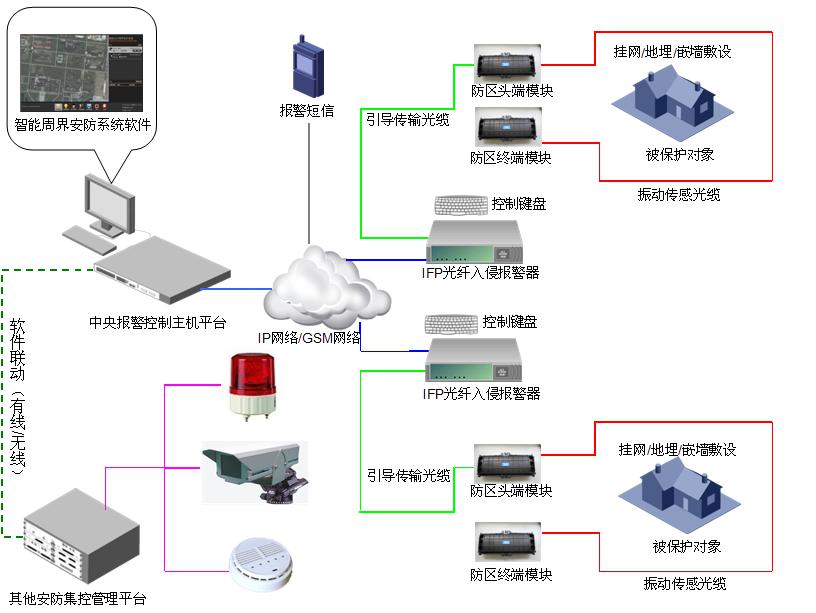 視項(xiàng)目大小,光纖入侵報(bào)警器IFP3800-IC08系列可獨(dú)立工作,也可采用網(wǎng)絡(luò)連接方式,將多臺(tái)設(shè)備聯(lián)網(wǎng)利用管理軟件集中管理,通過(guò)輸出開(kāi)關(guān)量實(shí)現(xiàn)硬件聯(lián)動(dòng),通過(guò)管理軟件實(shí)現(xiàn)軟件聯(lián)動(dòng)。對(duì)于較為重要的場(chǎng)所,還可在系統(tǒng)中接入聯(lián)動(dòng)攝像機(jī)進(jìn)行報(bào)警視頻復(fù)核。